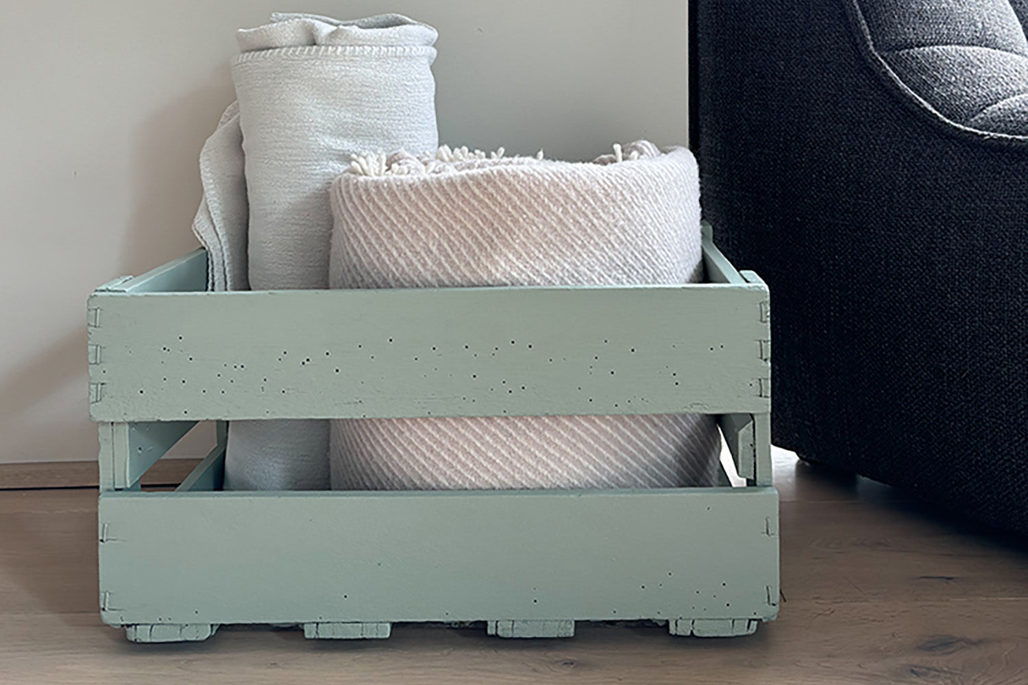 Nach der Trocknung kannst du deine Weinkisten als Dekoration in der Wohnung aufstellen oder zu Möbelstücken zusammenbauen.
