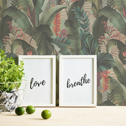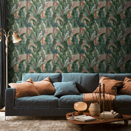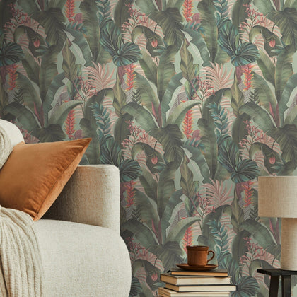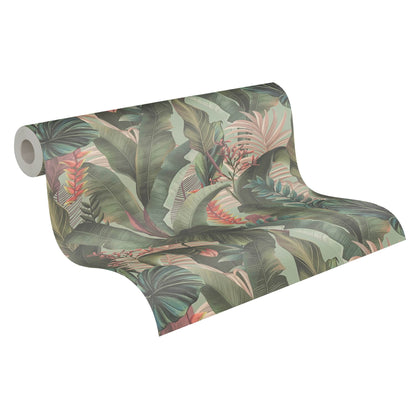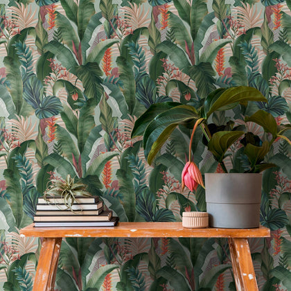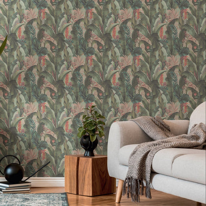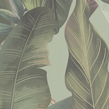 Ein helles Grüngrau bildet den Hintergrund. Palmen in verschiedenen Grüntönen verteilen sich über die Fläche. Dazwischen stehen Blüten in Rosa und Rottönen sowie weitere, feinere Blätter. Das Motiv zeigt ein üppiges, florales Dschungelmuster.