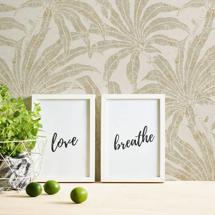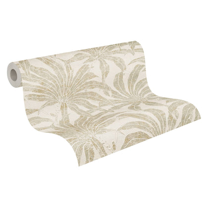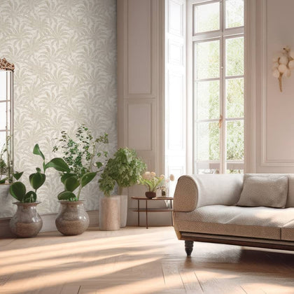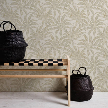 Ausladende, große Palmblätter bilden ein grafisches Muster auf hellbeiger Fläche. Die Blätter erscheinen in natürlichen Tönen wie Weiß, Creme und Beige und sind dezent mit leicht glänzenden Akzenten betupft. Das Design ist harmonisch auf der gesamten Fläche verteilt.