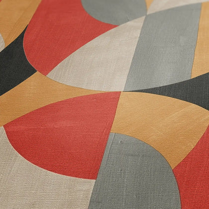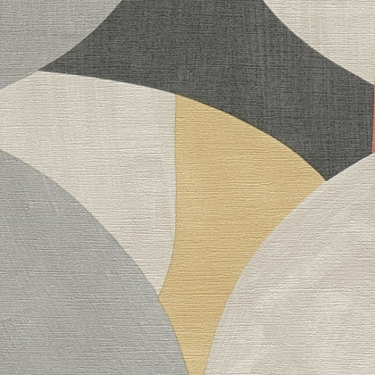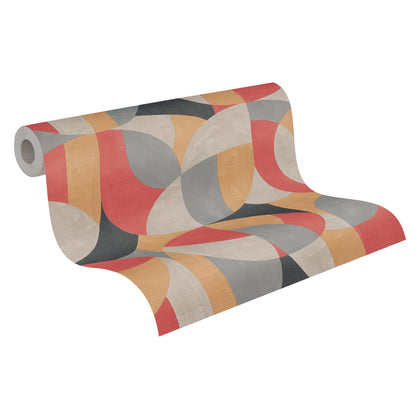 Die Tapete zeigt ein Retro-Motiv aus sanft ineinanderlaufenden Halbkreisen und abgerundeten Formen. Unterschiedlich große Farbflächen in Anthrazit, Grau, Creme, Gelb und Rot füllen die Fläche. Das Muster wirkt harmonisch und rhythmisch über die gesamte Wand verteilt.