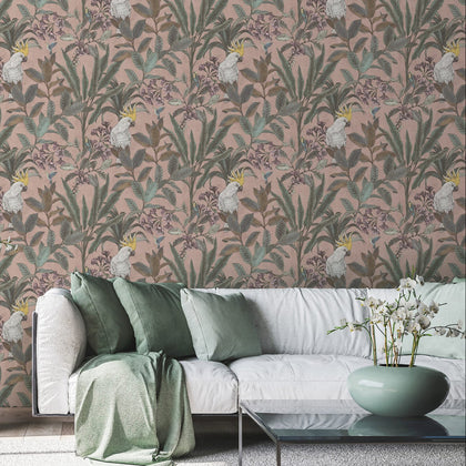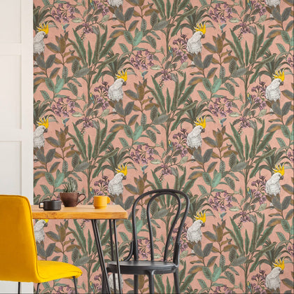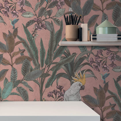 Die Tapete zeigt einen rosa Hintergrund mit einem floralen Dschungelmotiv. Grüne Blätter und rosa Blüten wirken dicht und lebendig. Hin und wieder ein weißer Kakadu und flinke Kolibris tauchen zwischen dem Blattwerk auf.