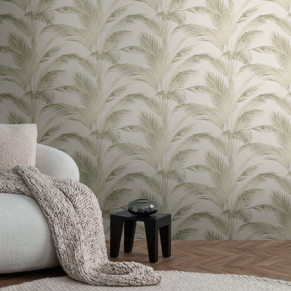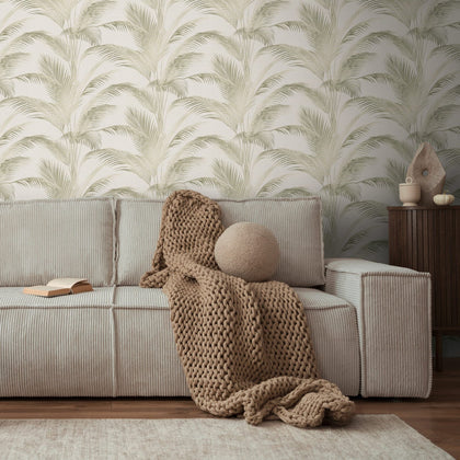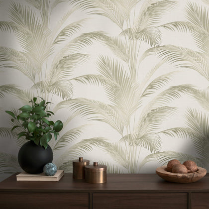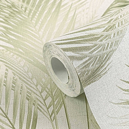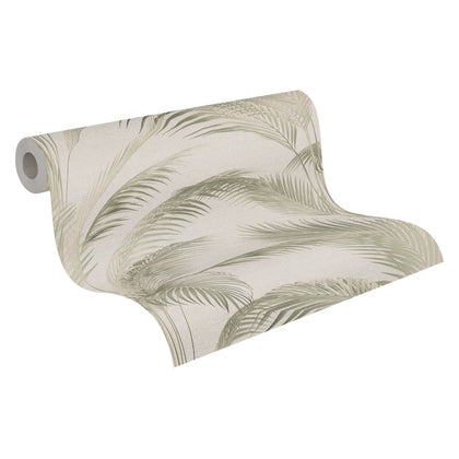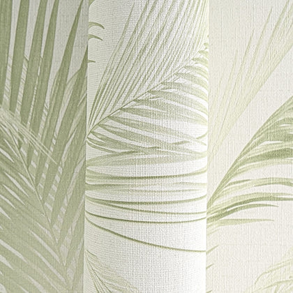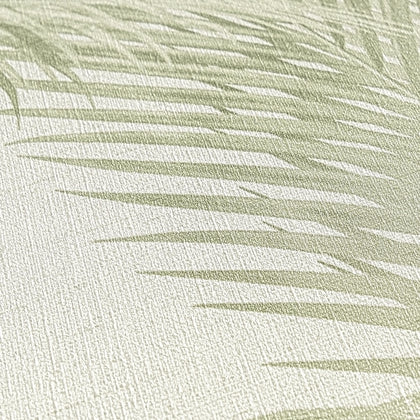 Filigrane, schlanke Palmenblätter in Grünnuancen reihen sich in vertikalem Muster über einen sehr hellen, cremefarbenen Untergrund. Die Blätter sind teils zart transparent, teils klar gezeichnet, wodurch sich feine Nuancen abzeichnen. Das Motiv ist naturalistisch gestaltet und wirkt leicht und luftig.