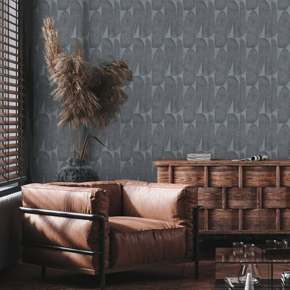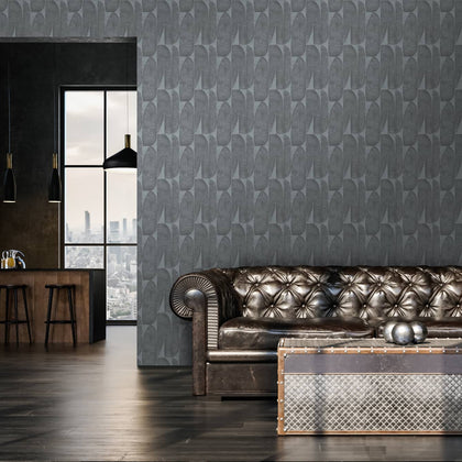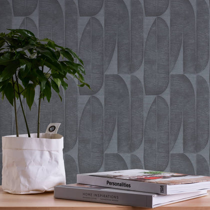 Abstrahierte Bananenblätter in Anthrazit ziehen sich senkrecht über einen dunklen Untergrund in Grau. Das Design ist reduziert und grafisch. Die Tapete verbindet zeitlose Klarheit mit stilvoller Zurückhaltung.