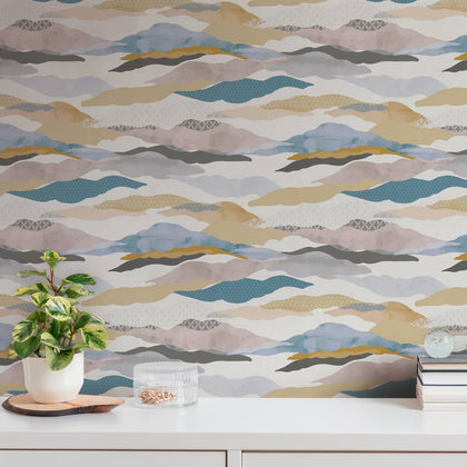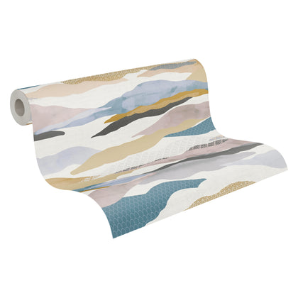 Weiche Wolken und Wellen in Gelb, Blau-Violett, Rosa, Petrol und Grau verteilen sich über einen cremefarbenen Hintergrund. Vereinzelt sind kleine, reduzierte Ornamente eingearbeitet. Das Muster ist waagerecht fließend, modern und grafisch angelegt.