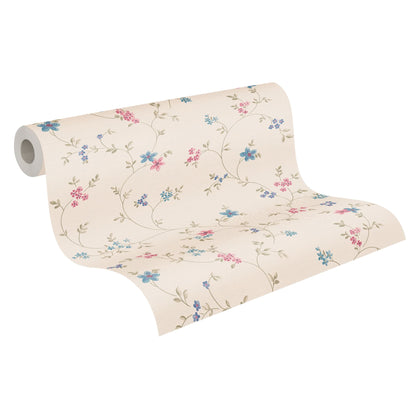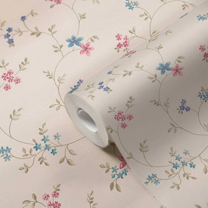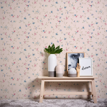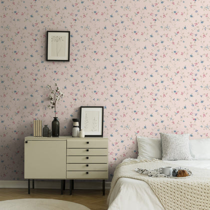 Ein helles Rosé bildet die Basis für ein feines Blütenmuster. Filigrane Ranken in zartem Grün und Blüten in Rosa und Blau erzeugen ein klassisches Motiv, das Wärme und Eleganz an deine Wand bringt.