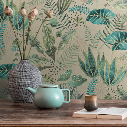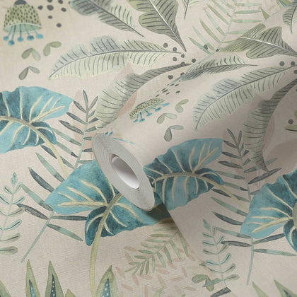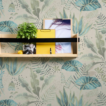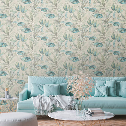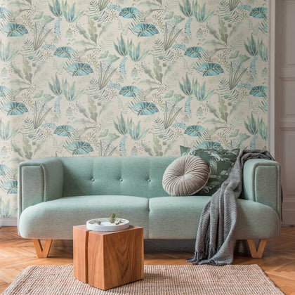 Auf cremefarbener Fläche zeichnen sich helle Palmblätter, Farne, Agaven und abstrahierte Blüten mit sanften Farbverläufen ab. Die Blätter zeigen verschiedene Grün- und Grautöne, während die Blüten diese Farbwelt harmonisch aufgreifen. Feine Punkte, leichte Schattierungen und getupfte Details ergänzen das verspielte Motiv.