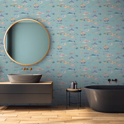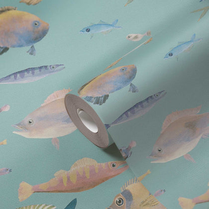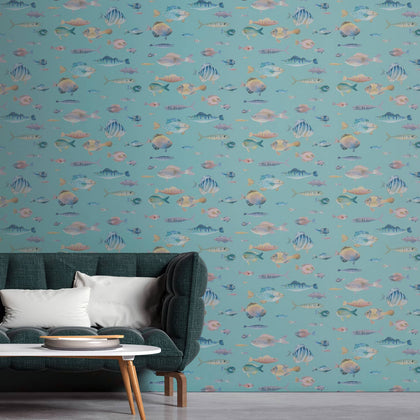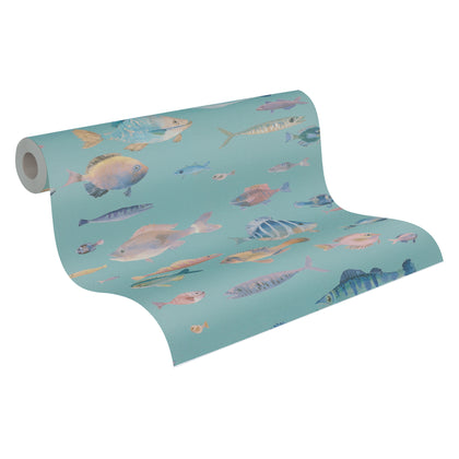 Der Hintergrund dieser Tapete ist ein sanftes Türkis und bildet die Bühne für eine lebendige Unterwasserwelt. Große und kleine Fische in bunten Farbverläufen – von Blau über Grün, Gelb, Rosa, Türkis bis Violett – erzeugen Bewegung und Leichtigkeit an der Wand.