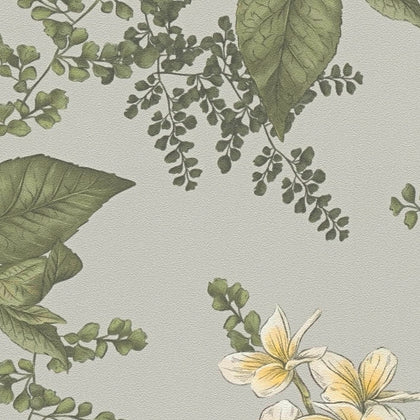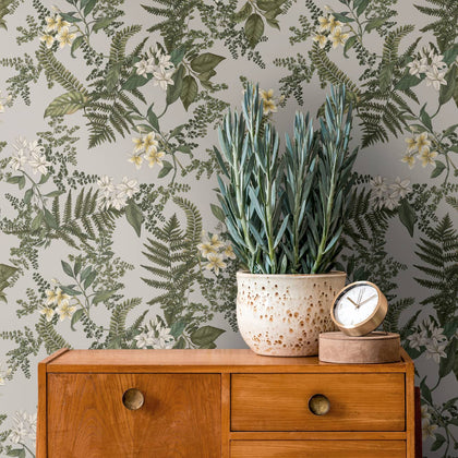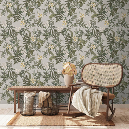 Ein heller Grauton bildet die Basis der Tapete. Darauf zeichnen sich Farne und Blätter in sattem Grün ab, ergänzt durch kleine Blüten in Weiß, Creme und Vanille. Das Muster ist fein gearbeitet und gleichmäßig über die Fläche verteilt.