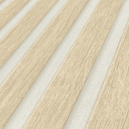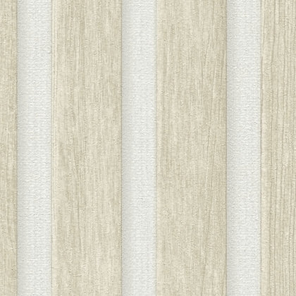 Schmale, helle Holzlamellen verlaufen senkrecht über die Fläche, dazwischen zeichnen sich Flächen in Weiß ab. Die abwechselnden Farbtöne erzeugen einen subtilen 3D-Effekt mit räumlicher Tiefe und verleihen der Tapete die Optik von Akustikpaneelen.