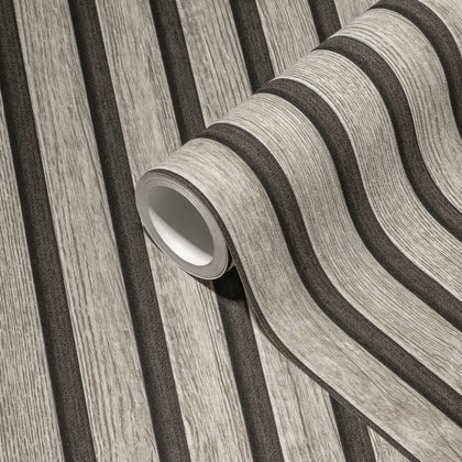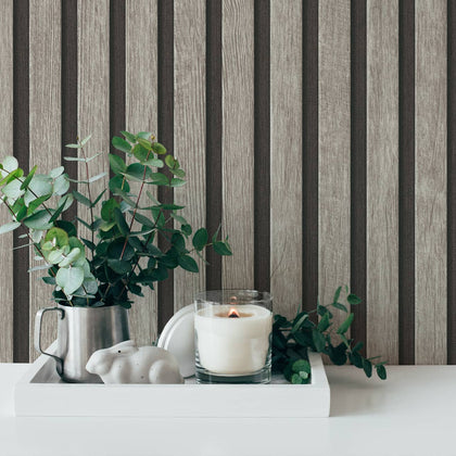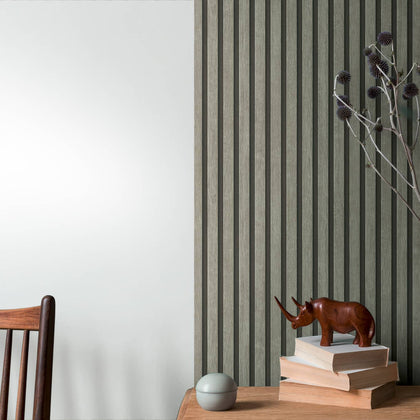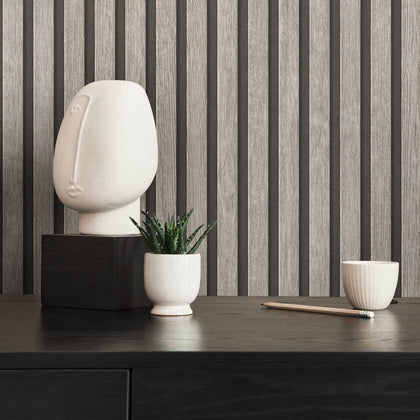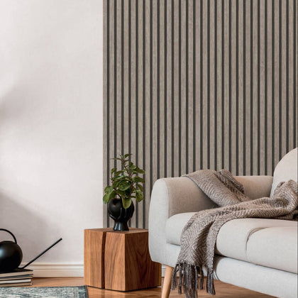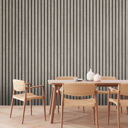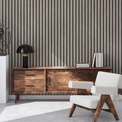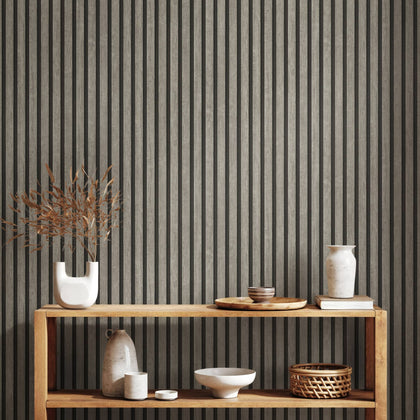Schmale, graue Holzlamellen verlaufen senkrecht über die Fläche, dazwischen zeichnen sich schwarze Flächen ab. Die abwechselnden Farbtöne erzeugen einen subtilen 3D-Effekt mit räumlicher Tiefe und verleihen der Tapete die Optik von Akustikpaneelen.