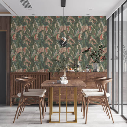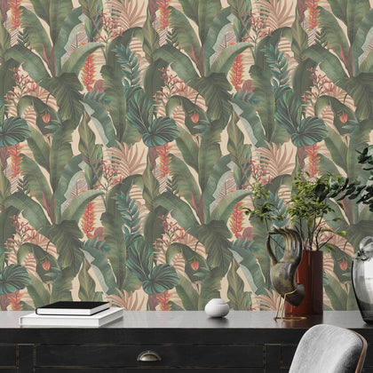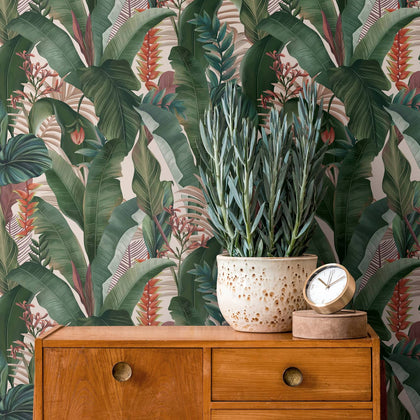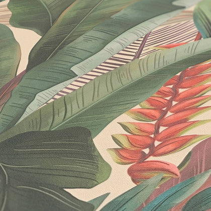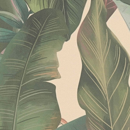 in helles Beige bildet den Hintergrund. Palmen in verschiedenen Grüntönen verteilen sich über die Fläche. Dazwischen stehen Blüten in Rosa und Rottönen sowie weitere, feinere Blätter. Das Motiv zeigt ein üppiges, florales Dschungelmuster.