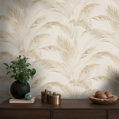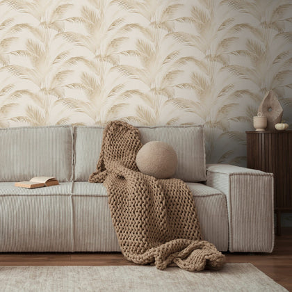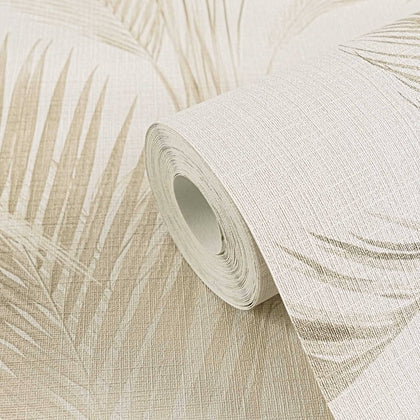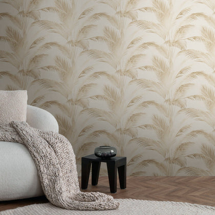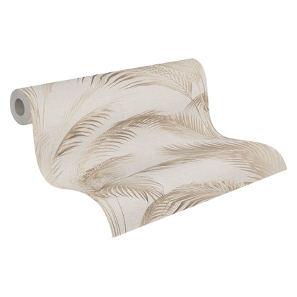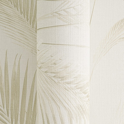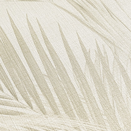 Filigrane, schlanke Palmenblätter in Beigenuancen reihen sich in vertikalem Muster über einen sehr hellen, cremefarbenen Untergrund. Die Blätter sind teils zart transparent, teils klar gezeichnet, wodurch sich feine Nuancen abzeichnen. Das Motiv ist naturalistisch gestaltet und wirkt leicht und luftig.