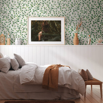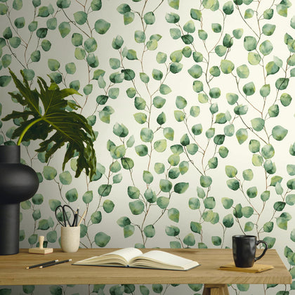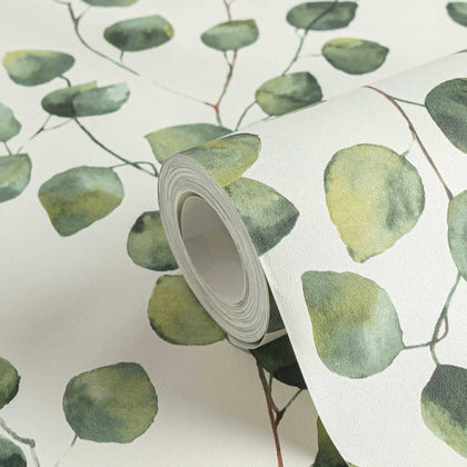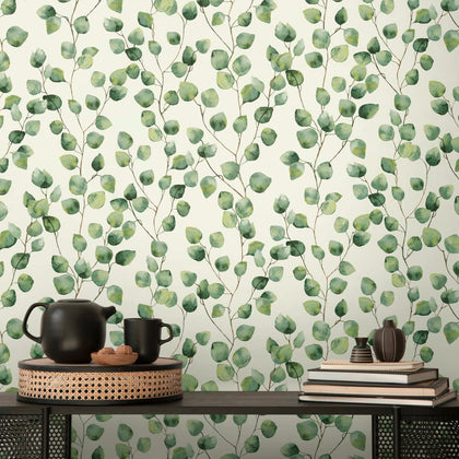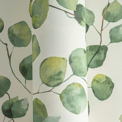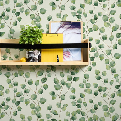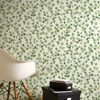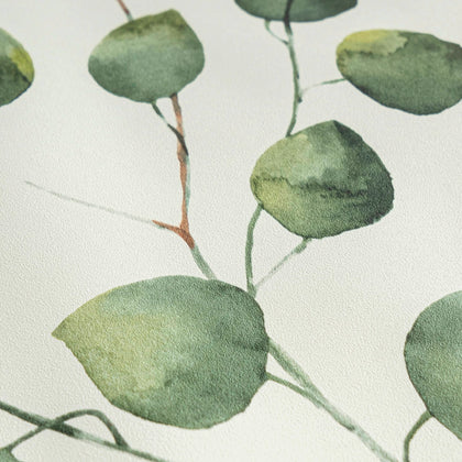 Auf einem hellen Cremeton ziehen sich viele kleine Blätter in frischem Grün über die Fläche. Die Blätter sind gleichmäßig verteilt und fein gezeichnet. Das Muster zeigt ein detailliertes, grafisches Blattwerk.