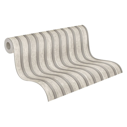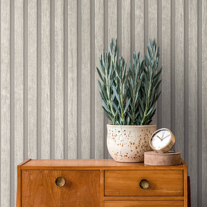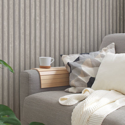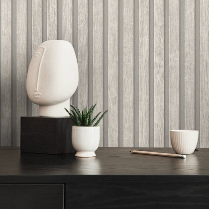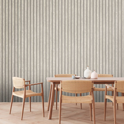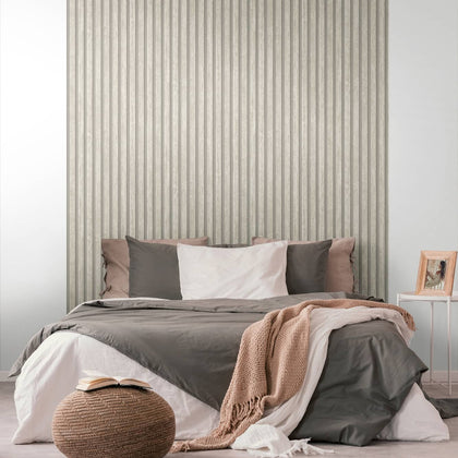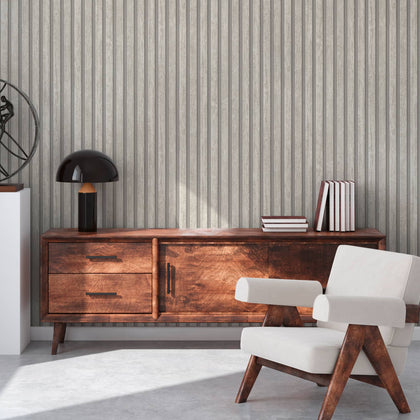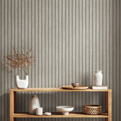 Schmale, graue Holzlamellen verlaufen senkrecht über die Fläche, dazwischen zeichnen sich Flächen in Mittelgrau ab. Die abwechselnden Farbtöne erzeugen einen subtilen 3D-Effekt mit räumlicher Tiefe und verleihen der Tapete die Optik von Akustikpaneelen.