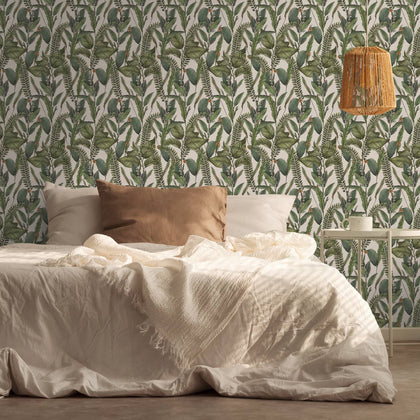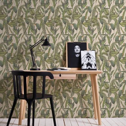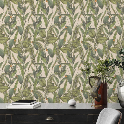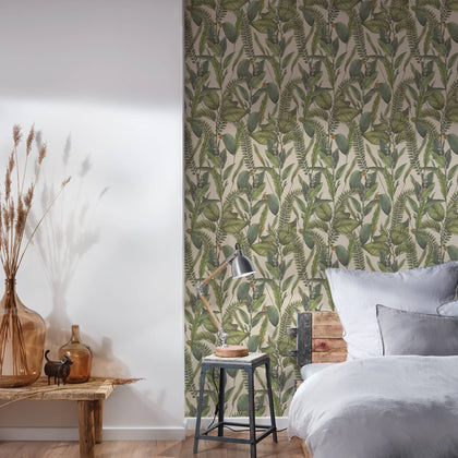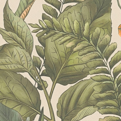 Auf einer hellbeigen Fläche breiten sich detailreiche Pflanzenmotive aus. Blätter in verschiedenen Grüntönen streben nach oben – schmal, gerundet und feingliedrig. Dazwischen sitzen vereinzelt kleine weiße Blüten, die das Muster ergänzen.