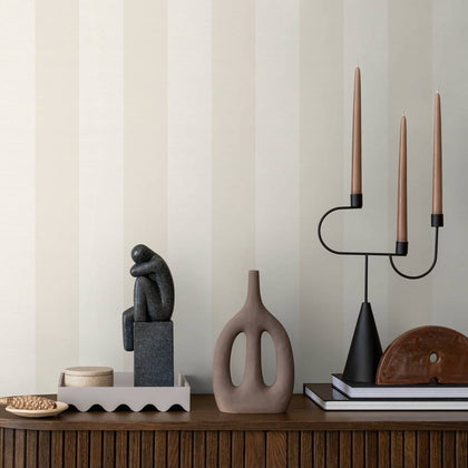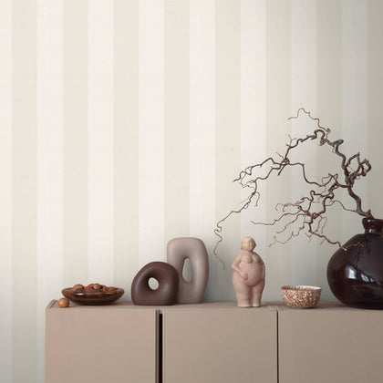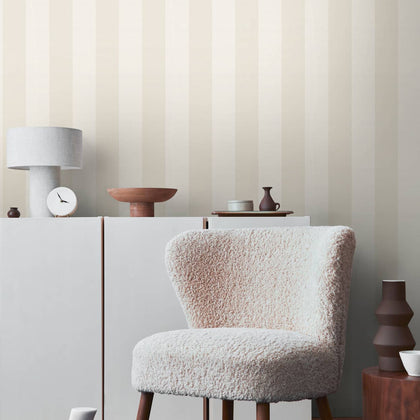 Cremeweiß und warmes Beige wechseln sich in senkrechten Streifen ab und ziehen sich elegant über die Wand. Das Muster ist schlicht, modern und dezent. Die Tapete lässt sich gut kombinieren und verbindet klassische Linienführung mit zeitloser Schlichtheit.