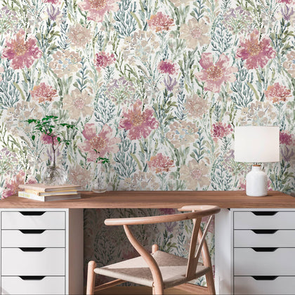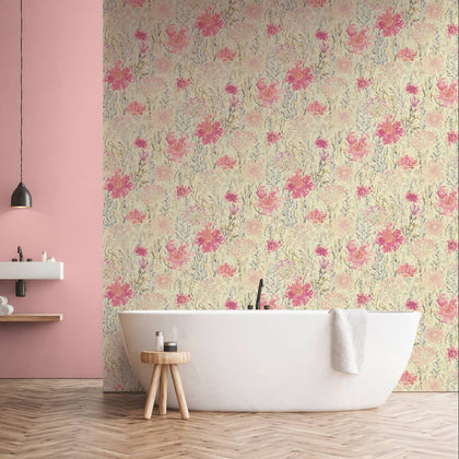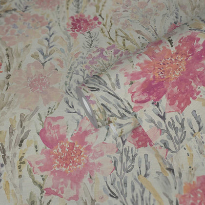Ein heller Hintergrund trägt große Blüten in Rosa und Pink, die in Aquarelloptik getupft erscheinen. Gefüllt werden die Blüten durch feine grüne Zweige und Blätter. Das Motiv zeigt ein detailliertes, florales Arrangement.