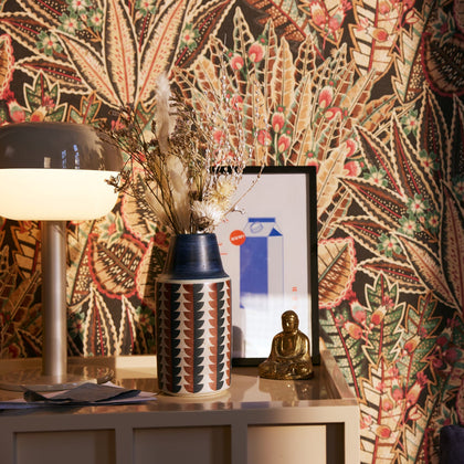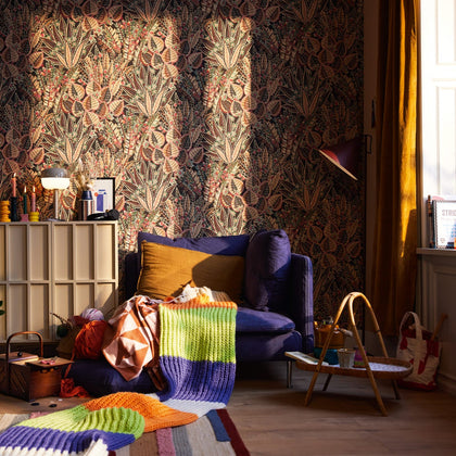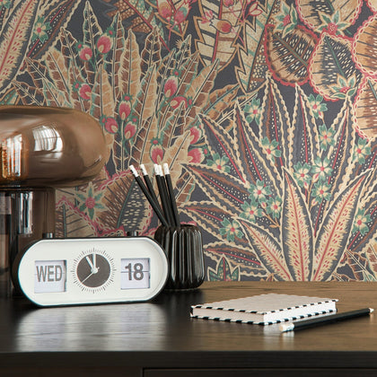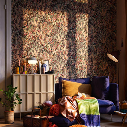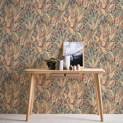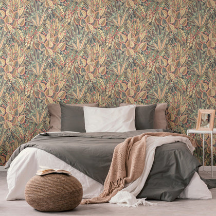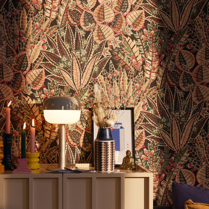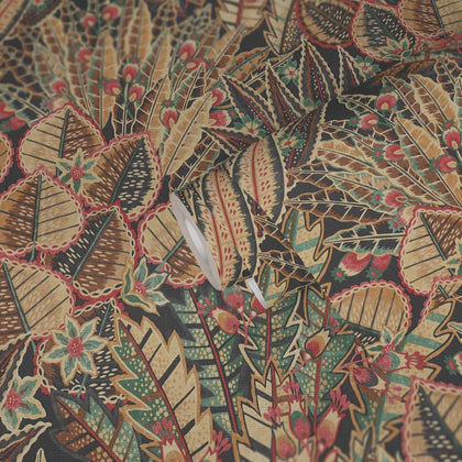 Auf dunkelbraunem Untergrund breiten sich zahlreiche Blätter und Blüten aus. Warme Beigetöne dominieren das Muster, ergänzt von Akzenten in Grün, Rosa und Rot. Das Design zeigt ein detailreiches, farbenprächtiges Pflanzenmotiv.