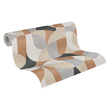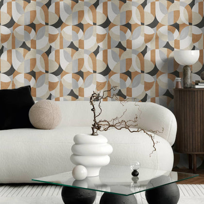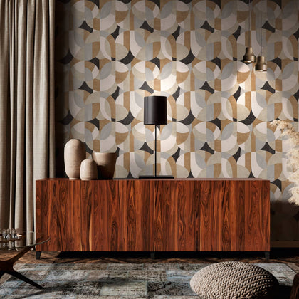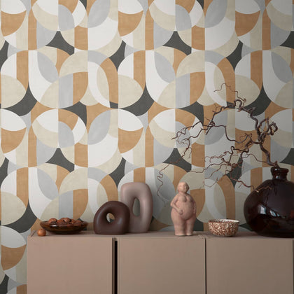 Die Tapete zeigt ein Retro-Motiv aus sanft ineinanderlaufenden Halbkreisen und abgerundeten Formen. Unterschiedlich große Farbflächen in Anthrazit, Grau, Weiß, Beige und Ocker füllen die Fläche. Das Muster wirkt harmonisch und rhythmisch über die gesamte Wand verteilt.