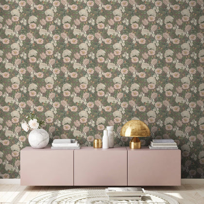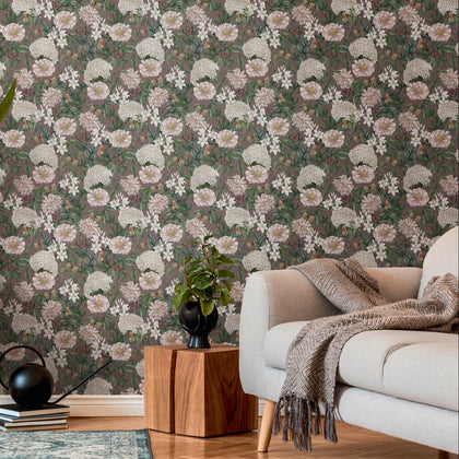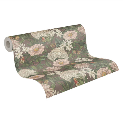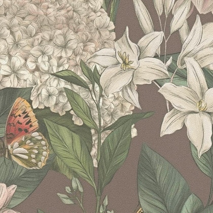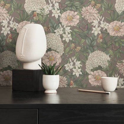 Auf taupefarbenem Grund entfalten sich rosa Wildrosen, weiße Hortensien und Jasminblüten sowie fein gezeichnete Blätter. Zwischen den Blüten fliegen Schmetterlinge, das florale Motiv ist detailliert und kunstvoll gestaltet.