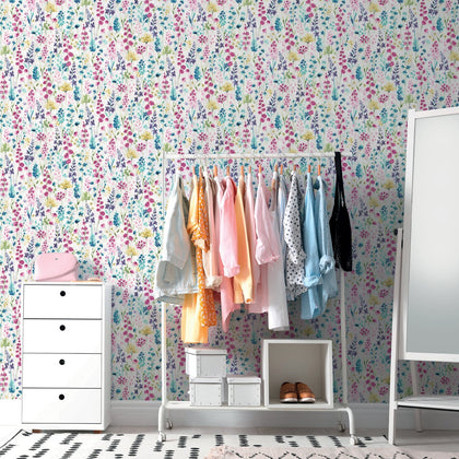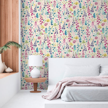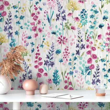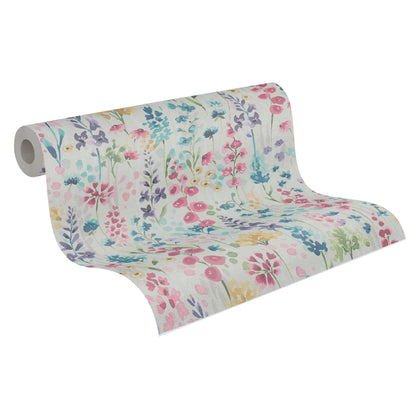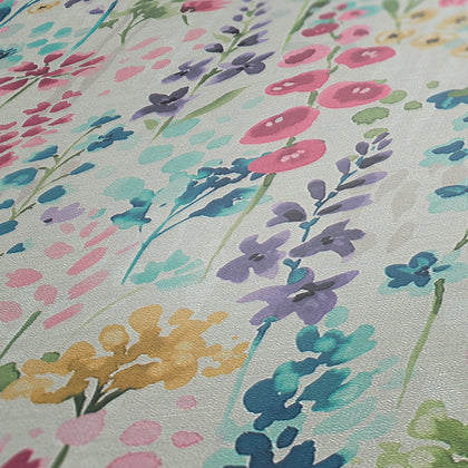 Feine Pflanzen mit bunten Blüten in Violett, Rosa, Türkis, Blau, Grün und Gelb scheinen locker über eine helle Fläche getupft. Das Aquarell-Muster erzeugt lebendige Akzente und verbindet Farbpracht mit künstlerischem Charme.