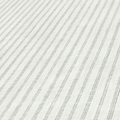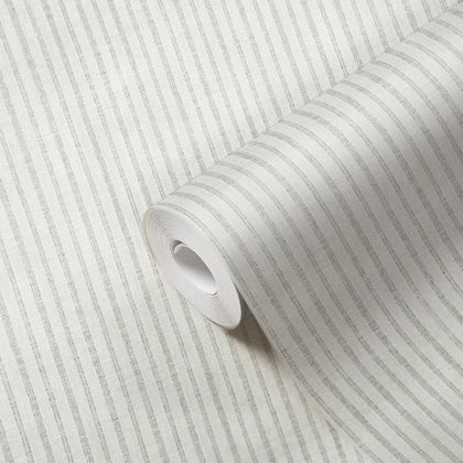 Feine Streifen in hellem Grau verlaufen über eine weiße Fläche. Das Muster ist reduziert, klar und grafisch. Die Tapete verbindet klassische Linienführung mit zeitloser Schlichtheit.