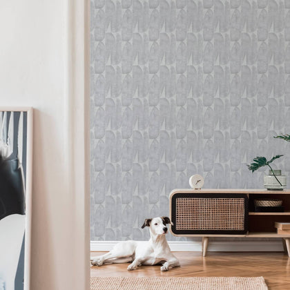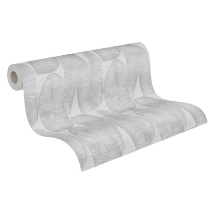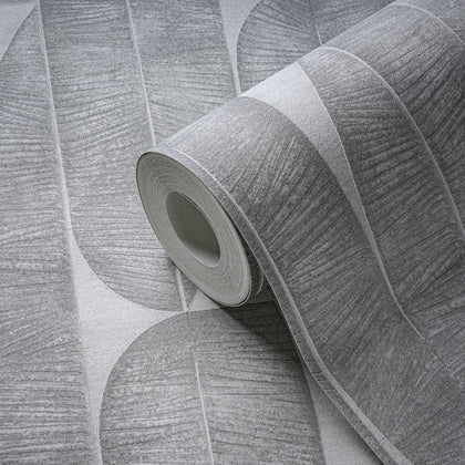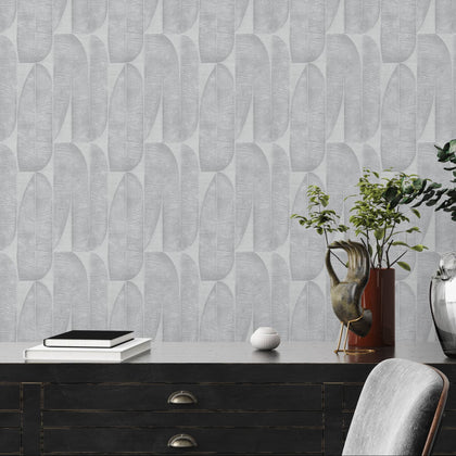 Abstrahierte Bananenblätter in gedämpften Grau ziehen sich senkrecht über einen sanften hellgrauen Untergrund. Das Design ist reduziert und grafisch. Die Tapete verbindet zeitlose Klarheit mit stilvoller Zurückhaltung.