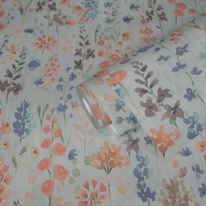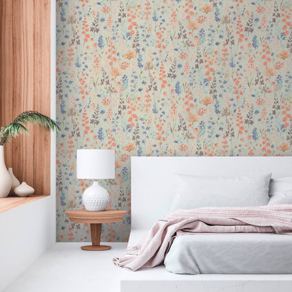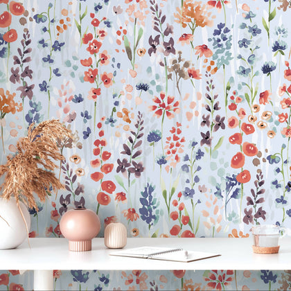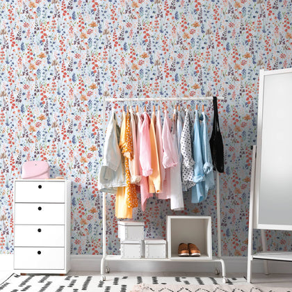Feine Pflanzen mit bunten Blüten in Rot, Orange, Blau, Türkis, Grün und Braun scheinen locker über eine helle Fläche getupft. Das Aquarell-Muster erzeugt lebendige Akzente und verbindet Farbpracht mit künstlerischem Charme.